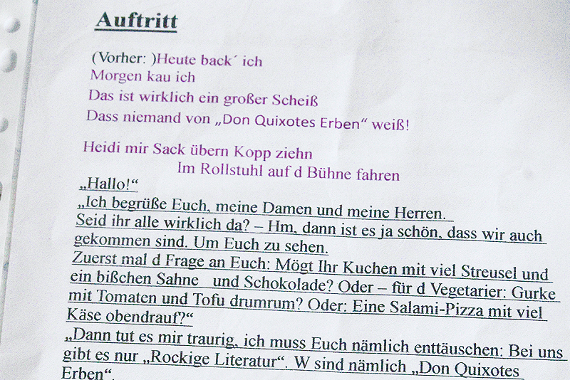 Gebt mir ein H!” Sehr zögerlich reagieren wir als Publikum. Das lässt der Mann auf der Bühne nicht gelten. “Noch einmal, ein H!” Es gelingt besser. “Gebt mir ein I, ein L, ein F, ein E!” Wir lernen schleppend. Das komplette “Hilfe! Hilfe!Hilfe!” müssen wir ebenso wiederholen. “Lauter!” Wir sind es nicht gewohnt, so zu schreien in der Öffentlichkeit. Wann braucht man das schon. Doch Mike Scholz erzählt den Alltag: “Können Sie mir bitte helfen und meine Schuhe zubinden!” Eigentlich eine einfache Bitte. Eigentlich. “Meint ihr nicht auch, dass man für so etwas eine spezielle Ausbildung braucht, eine Art Schnürsenkel-Management-Diplom?!” Das ist oft seine Erfahrung: Menschen, die genau so ticken. Stehlen sich damit aalglatt aus der Verantwortung. Ein bisschen fühle ich mich ertappt. Wie würde ich reagieren? Selbstverständlich und spontan: “Klar, kein Problem?” Oder doch nicht? … Während ich so noch nachsinne, wird ein weiterer provokanter Satz ins Publikum geschleudert: “Viele Deutsche sind wie kleine Köter …” Mike Scholz nimmt kein Blatt vor den Mund. Und so werde ich mitgerissen, beginne zu begreifen und spüre, dass die Zeit heute abend definitiv keine verlorene Zeit war, ebensowenig Klamauk. Im Gegenteil. Dank gilt Sven Scheunig alias Mike Scholz für seine Offenheit, Heide Schäfer und Berndt Meyer, den unperfekten Don Quixotes Erben.