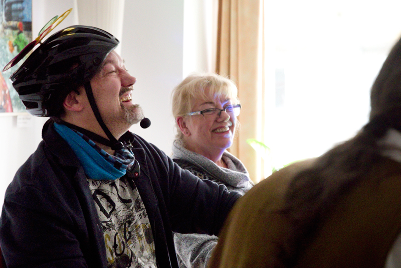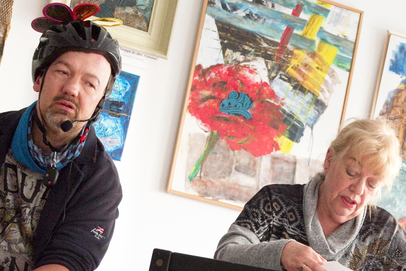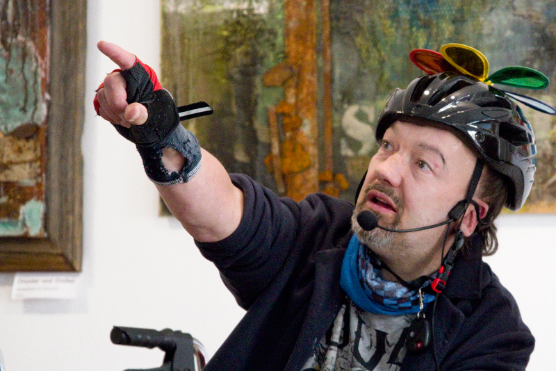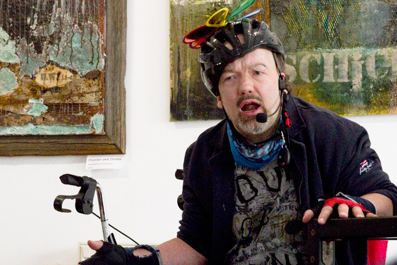 Eine kleine, lebensfroh wirkende Frau begleitet einen kräftig gebauten Mann mit einem Rollator und dirigiert ihn in die Lücke neben den Tisch. Der Mann wuchtet sich wankend eigenhändig auf den nächst stehenden Stuhl. Ich sehe auffallend schwere orthopädische Stiefel, dick gepolsterte gelenkschützende Bandagen. Er trägt einen dunklen Fahrradhelm mit einer verrückten bunten Kunststoffblume oben auf, in der Art eines Propellers. Verschroben? Grotesk? Musikalisch! Ich spüre Unsicherheit bei mir, bei anderen im Publikum. Wird das tatsächlich ein heiterer Abend mit Witz und Harmlosigkeiten? Ich muss genau hinhören, um die ersten Sätze zu verstehen. Der Mann spricht unsauber, nuschelt, tastet sich von Wort zu Wort. Kabarett? Comedy? Zu ernst entfaltet sich aber das Thema. Bergbesteigung. Sequenzen, Scherben. Verletzungen werden spürbar, Erlebnisse des Ausgegrenztseins eines körperlich zertrümmerten Menschen werden bruchstückweise erzählt. Mancher Satz impulsiv herausgeworfen. Ich höre Schmerz, im nächsten Moment beißenden Spott über Dummheit und Konsumgeramsche, Sich-selbst-genügen und einfaches Stumpfsein von Menschen, denen er täglich begegnet ….