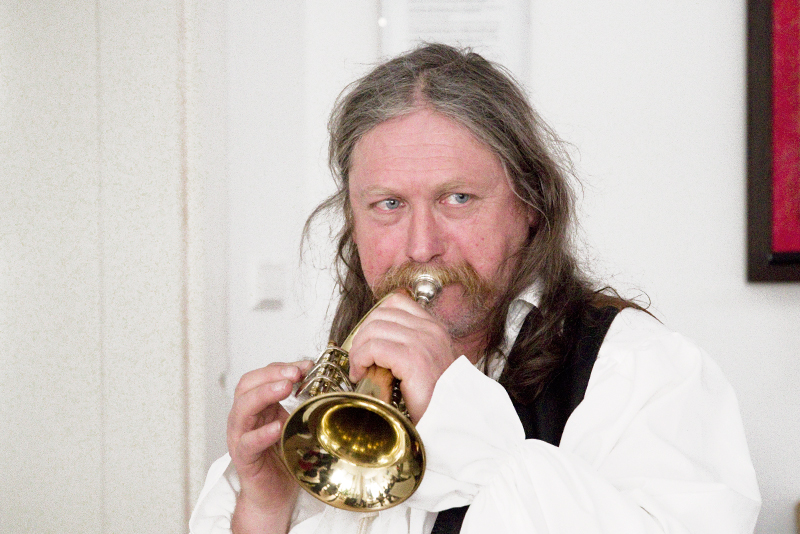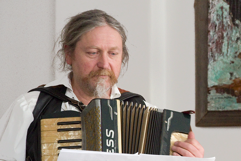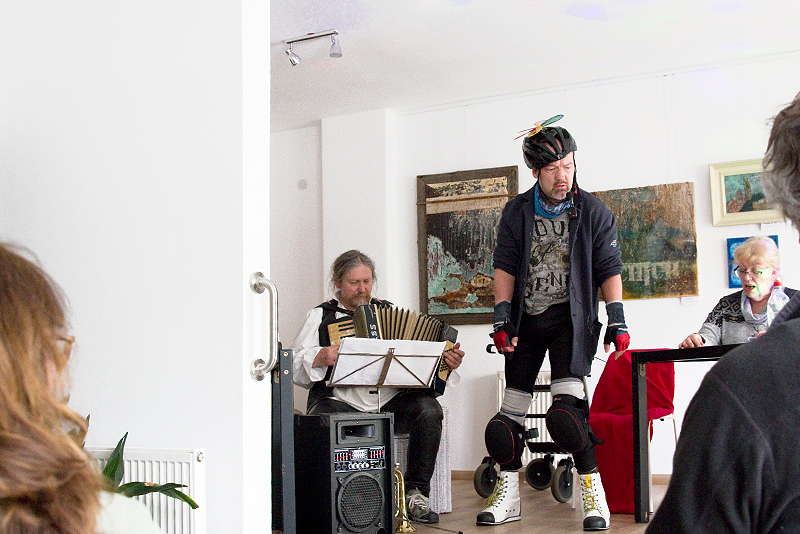 Verschroben! Grotesk! Musikalisch! Don Quixotes Erben. Der kleine Stadtteilladen wird etwas eng, denn eine Reihe interessierter Menschen haben sich diesen Abend frei genommen. Rainer Leschhorn vom Kulturverein Löbtau begrüßt uns Gäste. Heitere Stimmung herrscht im Publikum. Auf der provisorischen Bühne ein Akkordeon, Gitarren, eine Trompete, Tisch und zwei Stühle. Leise Töne erklingen. Berndt Meyer entlockt der alten Harmonika einige bröckelnde Melodiefragmente.