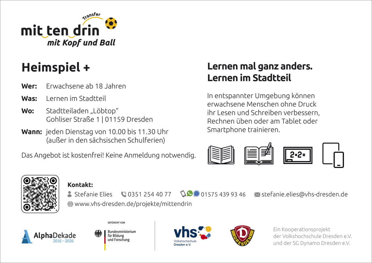 In entspannter Umgebung können erwachsene Menschen ab 18 Jahre ohne Druck ihr Lesen und Schreiben verbessern, Rechnen üben oder am Tablet oder Smartphone trainieren. Jeden Dienstag, nur nicht an Feiertagen und während der Schulferien.