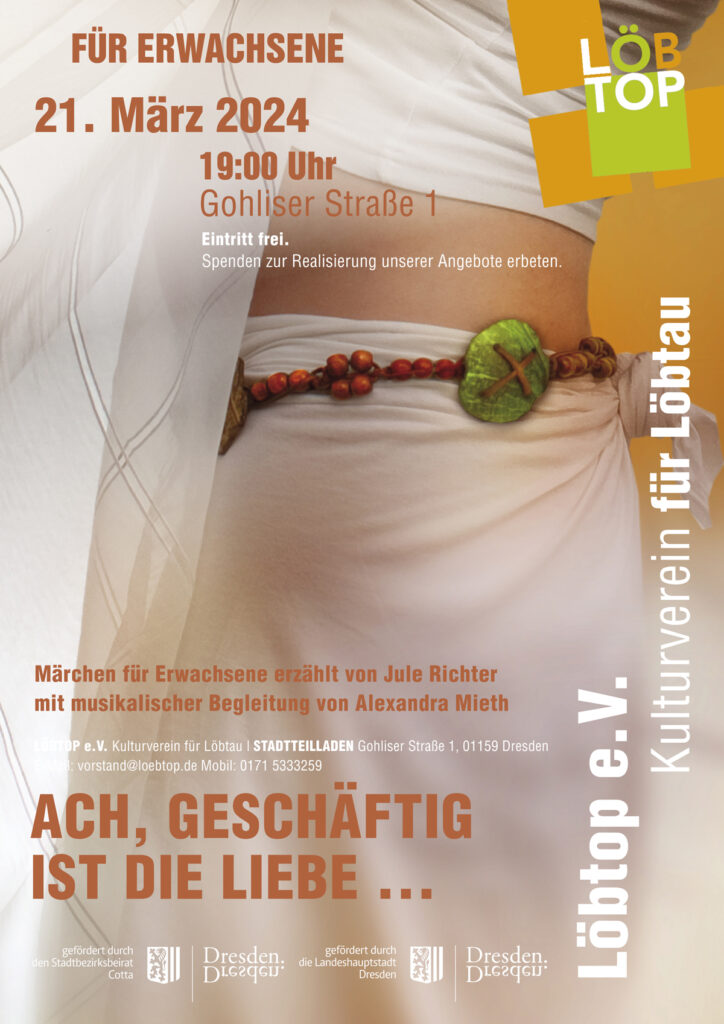Die professionelle Schauspielerin und Erzählerin Jule Richter erzählt Märchen für Erwachsene, mit musikalischer Begleitung von Alexandra Mieth auf verschiedenen Instrumenten.