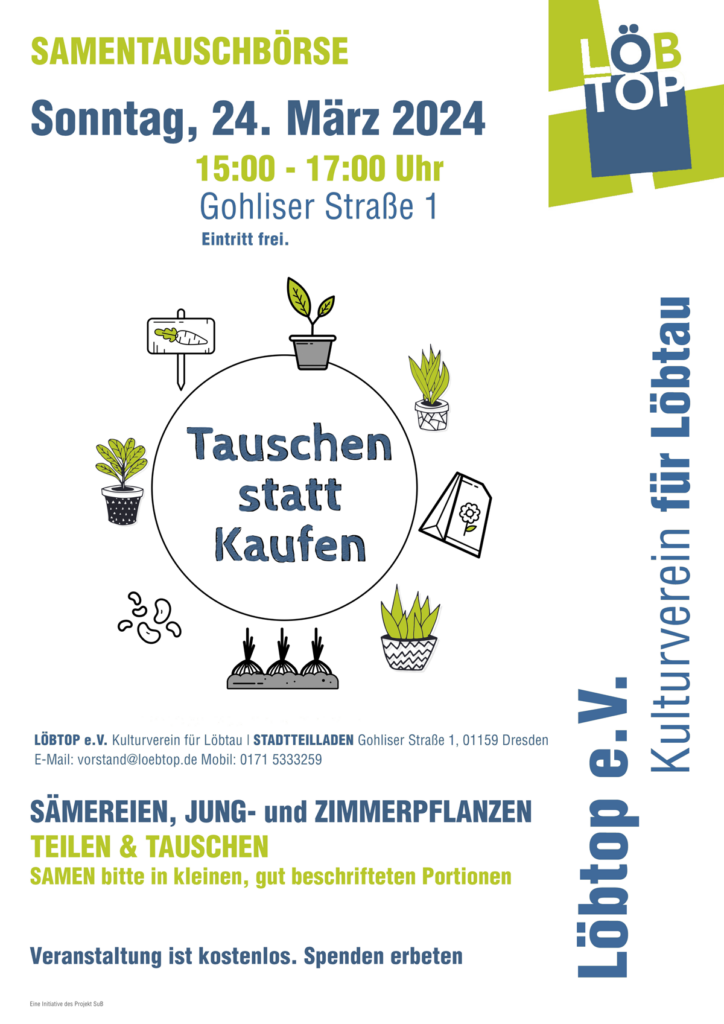 Sämereien, Jung- und Zimmerpflanzen. Die Samen bitte in kleinen Portionen, in gut beschrifteten Tütchen oder Dosen präsentieren.