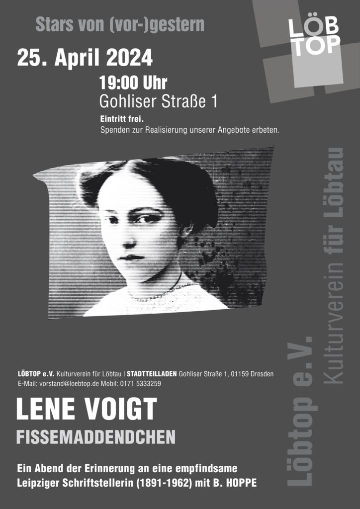 Der empfindsamen Leipziger Schriftstellerin Lene Voigt (1891 – 1962) wird dieser heitere Abend gewidmet sein, nicht nur wegen ihrer Fissemaddendchen. Herzliche Einladung in den Stadtteilladen.