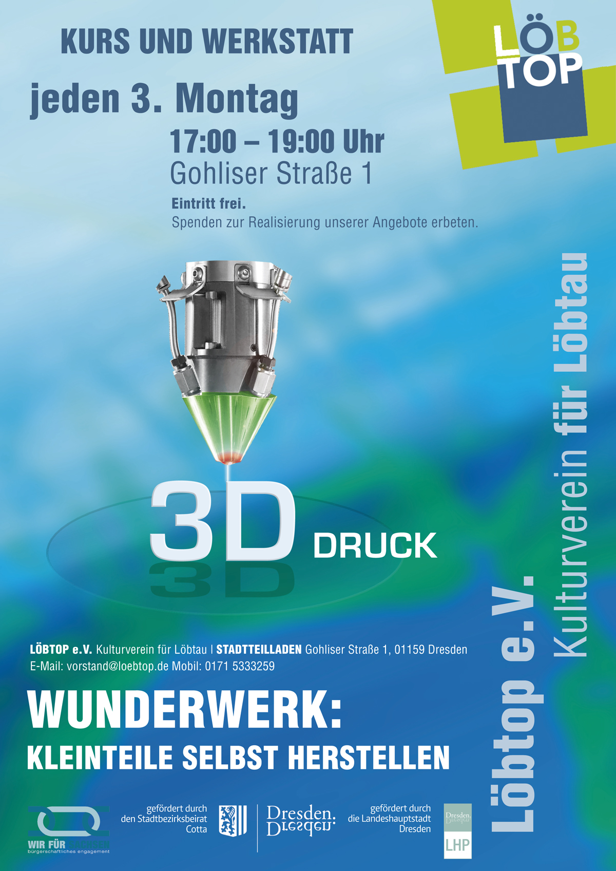 Mit 3D-Druck naht unter kundiger Hand eventuell Rettung. Neu konstruiert am PC oder das defekte Teil ausgemessen und mittels Software nachgebaut – den Rest erledigt eine kleine Düse, die das 300 Grad heiße Material in Form spritzt. All das direkt nun auch bei uns im Stadtteilladen. Zwei Termine haben wir als Test geplant. Maschine, Computer, Material und Kenntnis bringt der Fachmann mit.