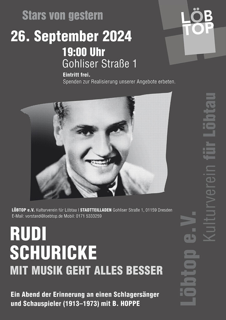 Mit Musik geht alles besser. Ein Abend in Erinnerung an den Schlagersänger und Schauspieler Rudi Schuricke (1913-1973). Herzliche Einladung in den Stadtteilladen.