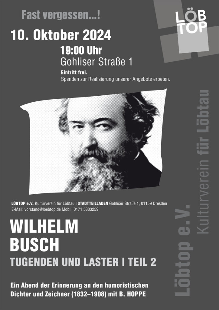 Den weniger bekannten Tugenden und Lastern des bekannten, humoristischen Dichters und Zeichners Wilhelm Busch (1832 – 1908) werden wir uns nun an einem zweiten Abend in lockerer Atmosphäre nähern. Herzliche Einladung in den Stadtteilladen.