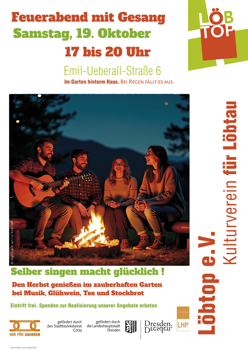 Sangesfreudige Löbtauer und Gäste finden sich im romantischen Garten um die Feuerschale zusammen, um ein paar allseits bekannte Lieder zu trällern. Es wird Gitarrenbegleitung geben und auch Glühwein, Tee und Stockbrot werden gegen kleine Spenden zu haben sein. Bei Regen fällt es leider aus.