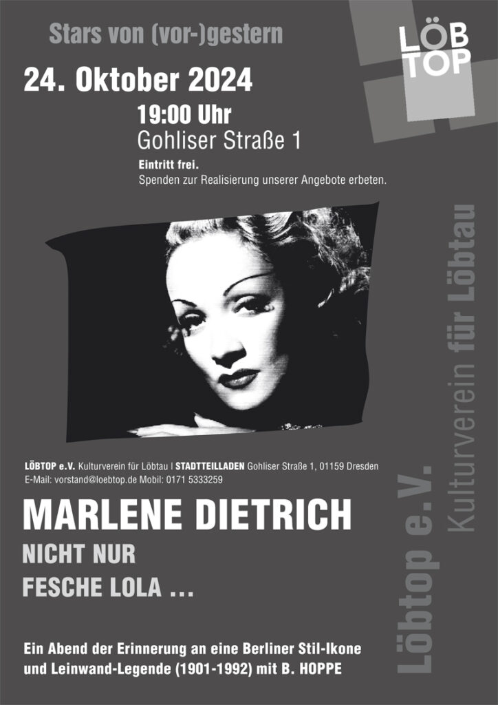 Ein Abend der Erinnerung an die Berliner Stil-Ikone und große Leinwand-Legende Marlene Dietrich (1901-1992). Herzliche Einladung in den Stadtteilladen.