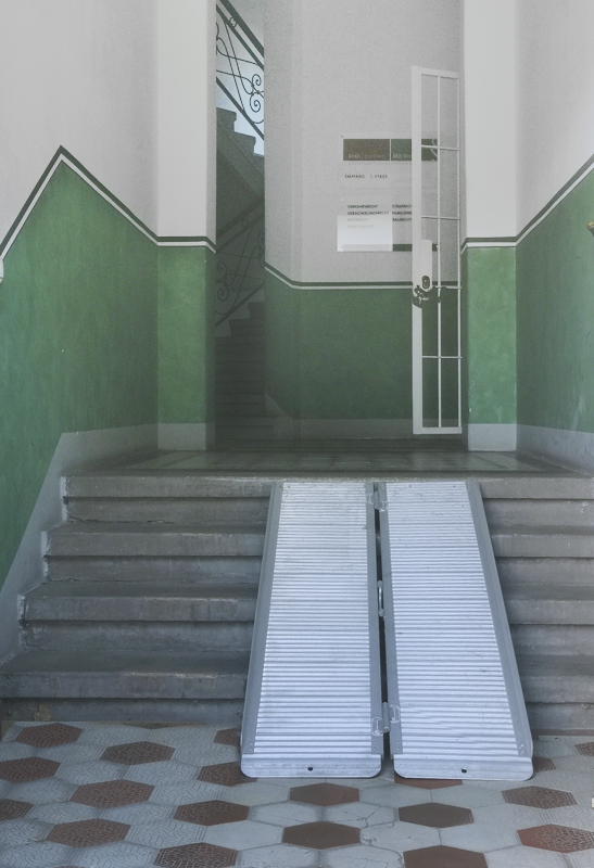 Nach Prüfung mit einem Elektro-Rollstuhl mussten wir nun leider feststellen, dass der Anstellwinkel der Rampe zu steil zumindest für diese schweren Fahrzeuge ist. Wir werden uns um eine zeitnahe bessere Lösung bemühen.