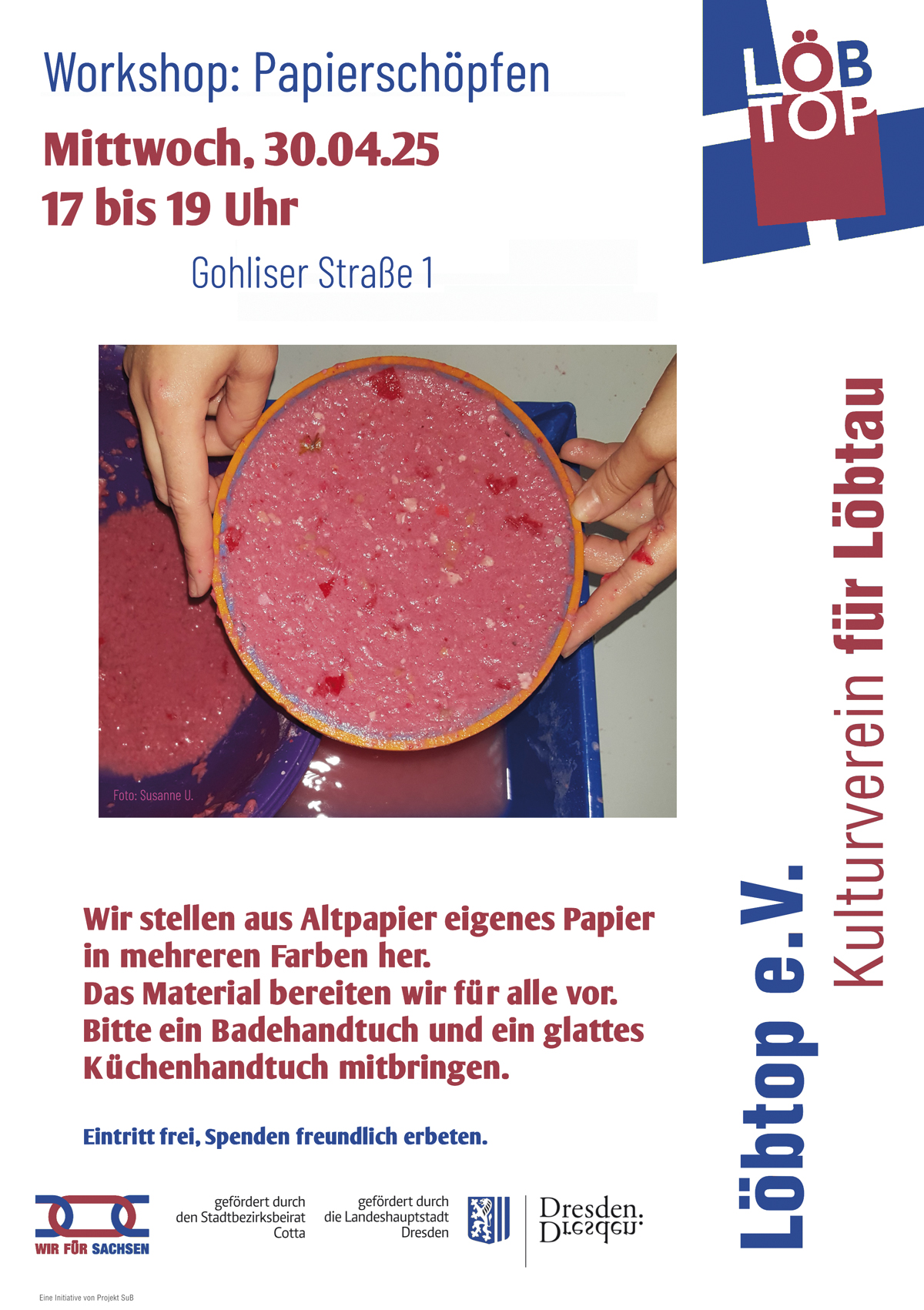 Wir stellen aus Altpapier eigenes Papier in mehreren Farben her. Das Material bereiten wir für alle vor. Bitte ein Badhandtuch und ein glattes Küchenhandtuch mitbringen.