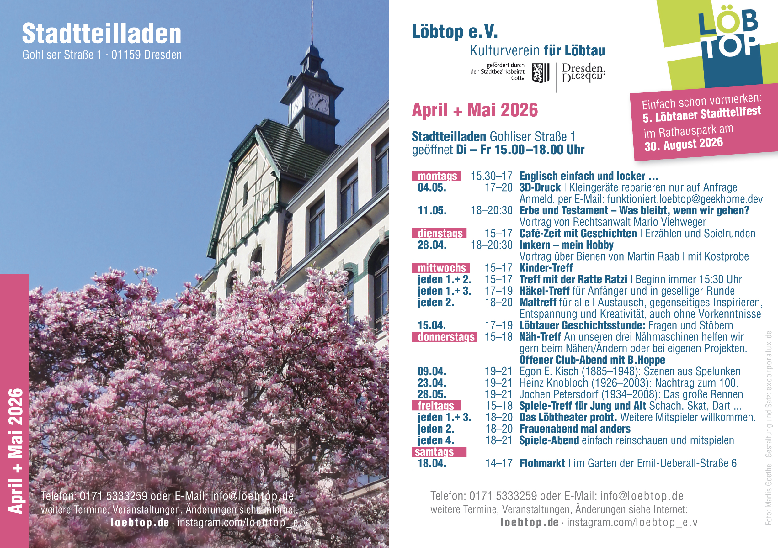 Das Programm der Monate April und Mai für den Stadtteilladen steht fest. In den nächsten Tagen werden die gedruckten Karten an den bekannten Orten im Stadtteil zu finden sein. Wer noch eine weitere gute Adresse zum Auslegen der Karten beisteuern kann, bitte einfach per E-Mail melden.