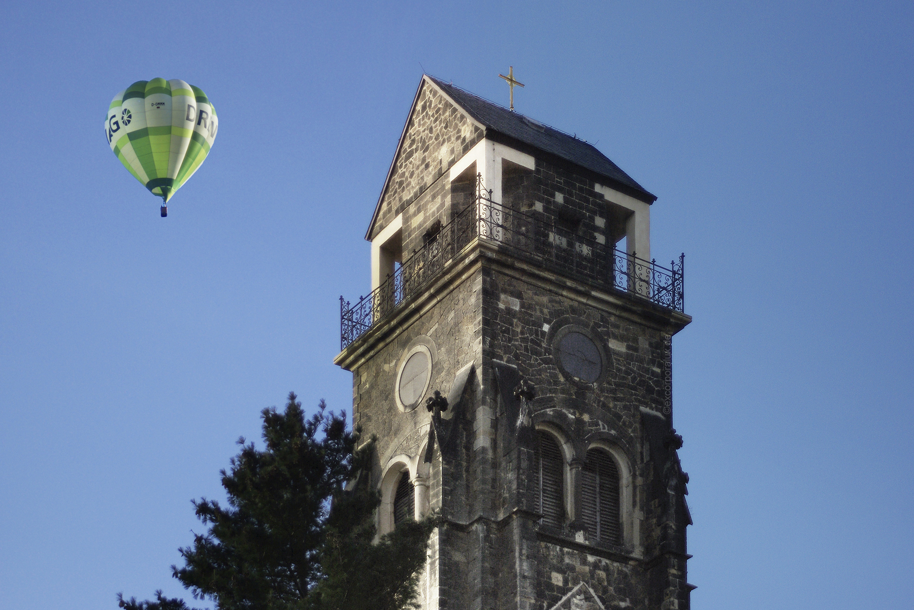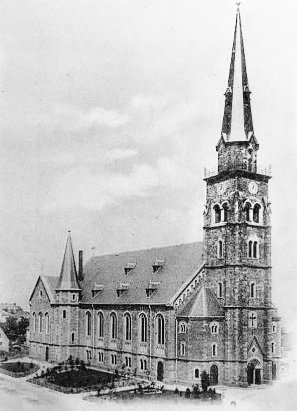 Friedenskirche heute mit markantem Notdach. Das ursprüngliche Turmdach und das Dach des Kirchenschiffes fielen der Bombardierung 1945 zum Opfer.
