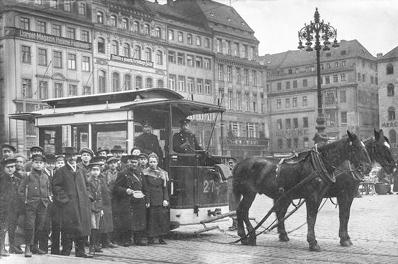 Pferdebahn, hier am Altmarkt in Dresden zur Abfahrt Richtung Löbtau